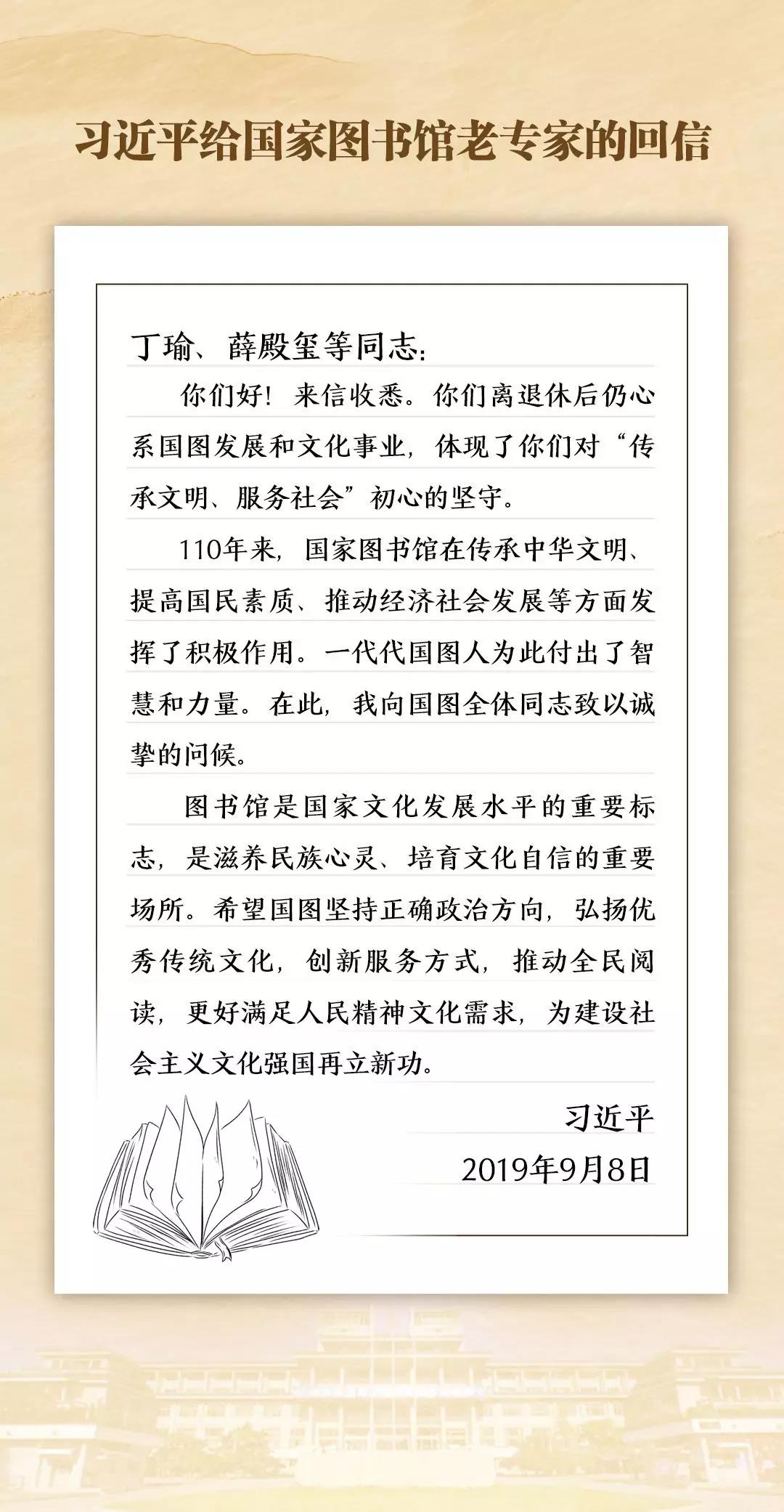 在國家圖書館建館110週年之際,習近平總書記給國家圖書館8位老專家回信,希望國家圖書館堅持正確政治方向,弘揚優秀傳統文化,創新服務方式,推動全民閲讀,更好滿足人民精神文化需求,為建設社會主義文化強國再立新功。