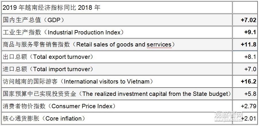 除了GDP指標外,2019年越南多個宏觀經濟指標表現突出,比如工業生產指數同比2018年上漲9.1%;商品與服務零售銷售指數同比上漲11.8%;越南國際旅客數量同比大漲16.2%。