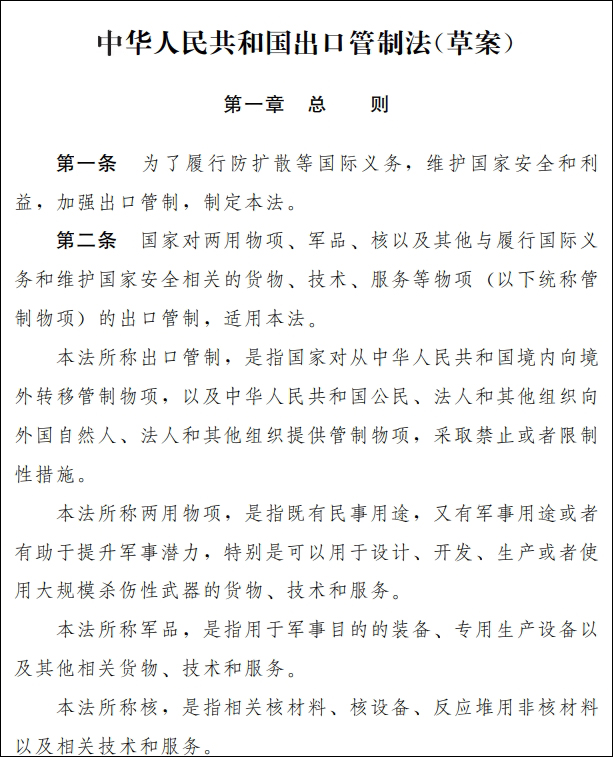 根據草案定義,出口管制是指國家對從中華人民共和國境內向境外轉移管制物項,以及中華人民共和國公民、法人和其他組織向外國自然人、法人和其他組織提供管制物項,採取禁止或者限制性措施。