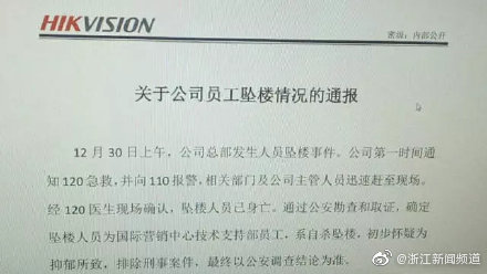 據騰訊《一線》12月30日報道,海康威視今天發佈的通報,該公司總部上午發生人員墜樓事件,通過公安勘察和取證,確定為國際營銷中心技術支持部員工,系自殺墜樓,初步懷疑為抑鬱所致,排除刑事案件,最終以公安調查結論為準。