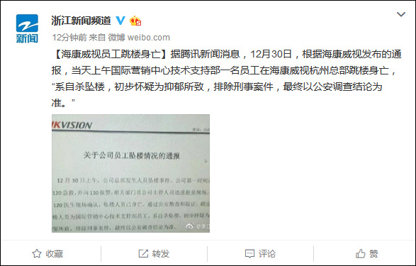 浙江新聞頻道官方微博也轉發了上述消息。根據通報,墜樓事件發生後,海康威視第一時間通知120急救,並向110報警,相關部門及公司主管人員迅速到場。經120醫生現場確認,墜樓人員已身亡。