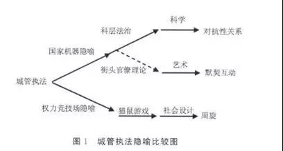 在行政執法關係中,城管與小販分別被界定為行政主體和行政相對人,雙方行為均受相關法律規範約束。執法規則的穩定性意味着行政主體與行政相對人行為的可預期性,即便遭遇剩餘立法權問題,也可以控制在比例原則等限定下的自由裁量範圍內。然而,街頭執法者,尤其是城管處於行政體系的末端,執法場景的特殊性和執法資源的有限性決定着其與相對人之間權力和權利勢能對比的流變性。在此情境下,行政法律關係主體之行為很難在“合法”“違法”間作出非此即彼的簡單劃分;對雙方行為策略的解讀也很難直接用常規法律關係術語去實現。不過,法律隱喻“以某種特定的價值取向為前提,通過兩個事物的並置,可以發現兩種事物之間存在着事先未被注意到或未被發現的相似性”,[1]這為解釋工作的推進提供了可能性。