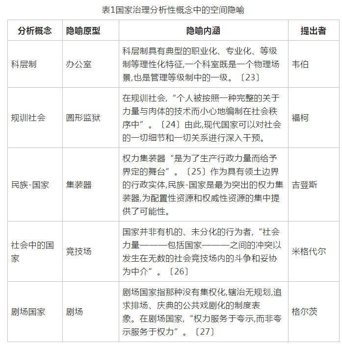 就隱喻性概念的生成而言,“沒有什麼人類本能比領地觀念更為根本”, [22]人們習慣於在其周圍加上界限以界定領地,從而對物體進行量化。為闡釋現代國家治理實踐,學者們創造了諸多具有空間隱喻色彩的分析性概念(見表1)。