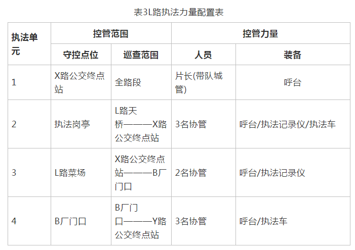 在日常治理過程中,L路城管中隊實行班組制,班組成員包括1名片長(帶隊城管)和16名協管員。其中,帶隊城管按行政事業單位規定的工作時間表正常上下班(每天8小時工作制,週末不上班);協管員則實行兩班倒(早班7:00-14:00;晚班14:00-22:00),每班8人。班組制在實際工作中又進一步分成三個小分隊。如表3所示,L路城管中隊根據街頭空間的特徵、人流集聚情況等綜合因素考量,選擇了四個點位作為布控地點。其中,X路車站是L路的交通樞紐和地理中心,片長親自守控,並在附近安排了一個執法崗亭,布控了3名協管員,配備呼台、執法記錄儀及執法車。L路菜場及B廠也是人流聚集、小販較多的區域,也分別作為布控點。由於協管員沒有執法權,各小分隊只開展巡查、勸阻等管理和服務工作,並不採取“暫扣(經營物品、工具)”等執法措施。在協管員管理無效的情況下,帶隊城管從各個點位調集人員、裝備集合到執法點位展開正式執法工作。