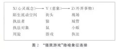 “貓鼠遊戲”也是一個隱藏的空間隱喻。在一般情境下,“貓鼠遊戲”是一種“街頭遊戲”。而在街頭行政和執法隱喻中,“街頭”空間特質是流動陌生的,是行政現場的感性意象。[28]並且,街頭執法的日常術語如守控、驅趕、巡邏、躲避等,都屬於隱喻系統。只不過,“貓鼠遊戲”隱喻包括多重象徵連接關係(見圖2)。在象徵關係中,X→Y聯繫是“本質固有的”;而Y→Z聯繫是“隱喻性的”,當這種聯繫約定俗成之後即成為“符號”。[29]就街頭執法而言,貓鼠關係特指執法者與執法對象之間的關係,它長期隱喻“警察-小偷”關係模式。將城管和小販也比擬成貓、鼠意象,顯然是“城管-小販”與“警察-小偷”關係模式之間有共同的心靈觀念。