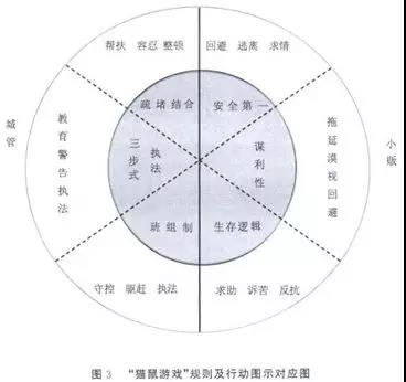 城管執法的每一個原則和行動圖示,都在小販那裏激起了回應。“貓鼠遊戲”規則的本質是,城管和小販在行動框架範圍內,在各自行動圖示儲藏庫中選擇合適的“計策”,形成了一種特定且明確可察的對應關係。