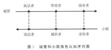 據此,城管和小販對各自的角色認知,很多情況下是錯位的。即,城管“執法者”角色的建構往往建立在小販“違法者”的標籤化上;但小販恰恰並不認可自己是“違法者”,對城管“執法者”的角色認知也最弱。而小販最為普遍、也最為強烈的角色認知是“求助者”,繼而對城管的角色期待是“服務者”,但城管恰恰不太認可其“服務者”的角色。就“貓鼠遊戲”的實踐形態而言,“執法者/求助者”和“服務者/違法者”反而是常見的角色互動關係。當然,在“各退一步”的意義上,“管理者/越軌者”的角色互動關係是雙方都能接受的認知模式。
