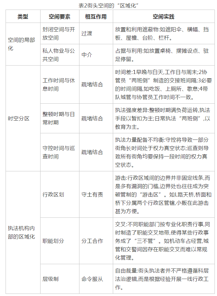 街頭空間邊緣化特徵的形成,是社會空間區域化機製造成的結果(見表2)。區域化不僅包括空間的局部化,還涉及了與各種例行化的社會實踐發生關係的時空分區。[36]在城管執法中,區域化主要表現在三個方面:①街頭空間的局部化。具體而言,小販通過對街頭空間的佔據和利用,使得其物權性質發生變化;②城管執法的時空分區。即城管部門通過正式和非正式的時間表,實現時間的區域化;③執法機構內部的區域化。行政區劃、部門職能劃分以及上下級之間的分工,都在客觀上導致執法權的分裂。區域化在實現區域內部的配置性資源和權威性資源集中的同時,也製造了區域之間權力實踐的邊界區。客觀上,街頭空間是不同階層、不同觀念、不同經濟行為相會、接觸、融合、毗鄰的地方,國家權力的“本意”並無可能完全在此實現。