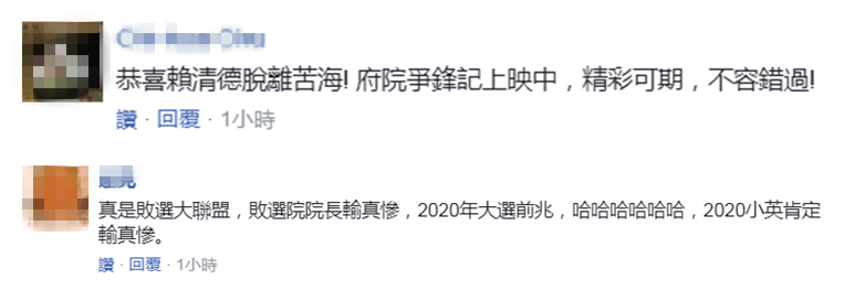 對此,台灣網友諷刺,恭喜賴清德脱離苦海;還有網友表示,在新北市選舉中失利的蘇貞昌組新“內閣”為“敗選聯盟”,2020蔡英文會輸更慘。↓
