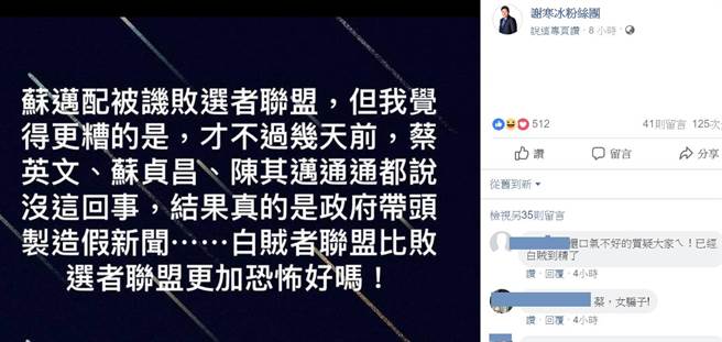 據台“中時電子報”報道,島內名嘴謝寒冰昨日在臉書發文稱,“蘇邁配”被譏“敗選者聯盟”,但他覺得更糟的是,幾天前,蔡英文、蘇貞昌、陳其邁對“組閣”一事都説沒有,結果真的是蔡當局帶頭製造“假新聞”…“白賊者(閩南語,説謊之意)聯盟比敗選者聯盟更加恐怖好嗎!”