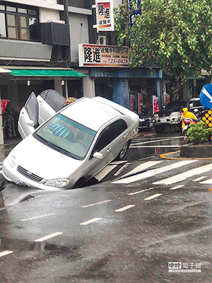 去年8月底高雄連日大雨,高雄市一心、和平路口出現超大天坑,汽車活生生被吞進洞裏,所幸駕駛員自行逃脱無礙。(圖片來源:台灣“中時電子報”)