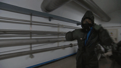 這個地下坑道呢,上下相連左右相通,有很多的區域,和我們小時候鑽的那個山洞呢很相似,但是不同的呢,是多了很多這些現代化的通風的管道呀、電路啊管線系統,再往前面走呢,是紅色區域,是不允許我們這次採訪進入的區域。綠色區域呢,可以進行採訪,下面呢,我們就到生活區先來看看。