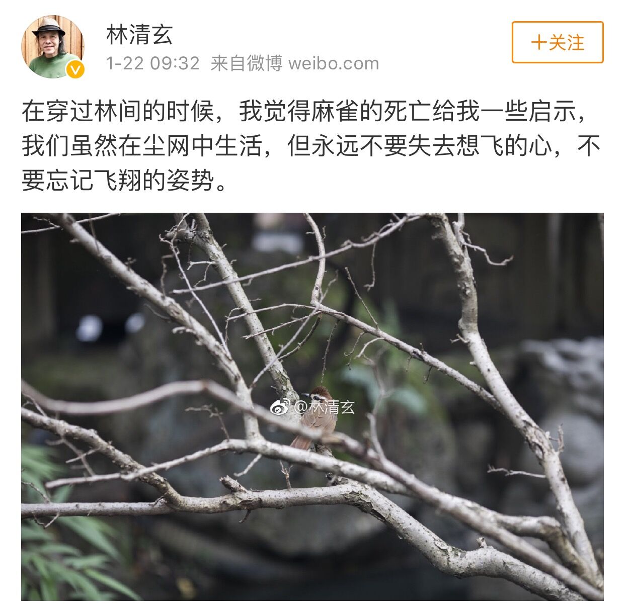 他寫道:“在穿過林間的時候,我覺得麻雀的死亡給我一些啓示,我們雖然在塵網中生活,但永遠不要失去想飛的心,不要忘記飛翔的姿勢。”