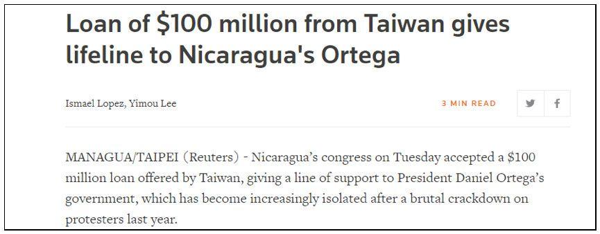 根據英國路透社的報道,台灣當局宣稱這筆1億美元的貸款,是出於人道主義而提供給尼加拉瓜的,目的是為了恢復該國自去年國內爆發嚴重政治危機以來受損的經濟和民生。