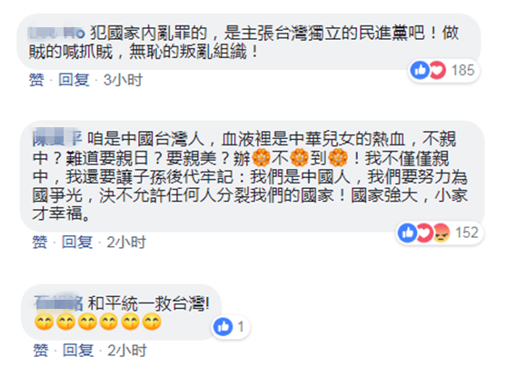 黃智賢的言論獲得兩岸網友的支持。有台灣網友怒批,犯“國家內亂罪”的是主張“台獨”的民進黨吧!還有網友表示,咱們就是中國台灣人,血液裏是中華兒女的熱血,不“親中”,難道要親日、親美?絕不允許任何人分裂我們的國家。和平統一救台灣。↓