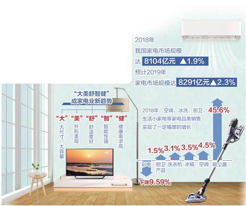 全國家用電器工業信息中心預測,2019年家電市場規模有望達8291億元,同比增長2.3%。消費升級、產業升級的大趨勢不會變,品質化、高效化、細分化將是家電產品發展的主旋律。