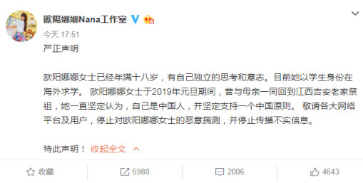 21日下午,歐陽娜娜工作室發表聲明稱,歐陽娜娜一直堅定認為,自己是中國人,並堅定支持一箇中國原則。↓