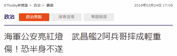 台媒3月24日報道稱,台軍“武昌艦”3月初在左營軍港進行裝備保養及準備遠航支隊的訓練,一名士兵7日從3層樓高的甲板不慎摔到碼頭上,造成多處骨折,緊急送醫後恐半身不遂。當天“武昌艦”要求全艦官兵注意工作安全,但僅在4天后,又有一名士兵11日從上下軍艦的梯口摔落碼頭,造成多處擦傷。