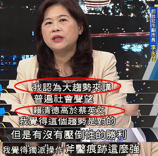 前台北市副市長李永萍則認為,從大趨勢而言,賴清德的社會聲望高於蔡英文,這點沒問題,但如此“壓倒性的勝利”,只能説是“獨派”操作的痕跡太重,這於民進黨的選情不是件好事。
