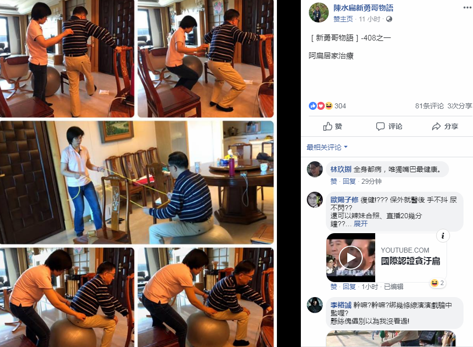 除此之外,陳水扁還曾於11日上傳自己復健的照片。對此,台灣《聯合報》報道稱,他顯然想杜絕外界對其健康的質疑。台灣“中時電子報”則提及,藍營“立委”上月發動“把阿扁關回去”聯署,目前突破30萬人,陳水扁見外界的不滿聲浪苗頭不對,於是貼出幾張照片來澄清。而網友則嘲諷陳水扁“少裝了”。