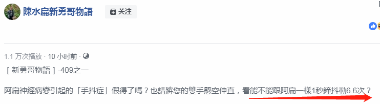 此視頻是陳水扁於4月12日凌晨上傳於社交網站“臉書”的“陳水扁新勇哥物語”賬號,時長3分多鐘。在視頻中,陳水扁伸出雙手,用會抖的右手和正常的左手做比較↓