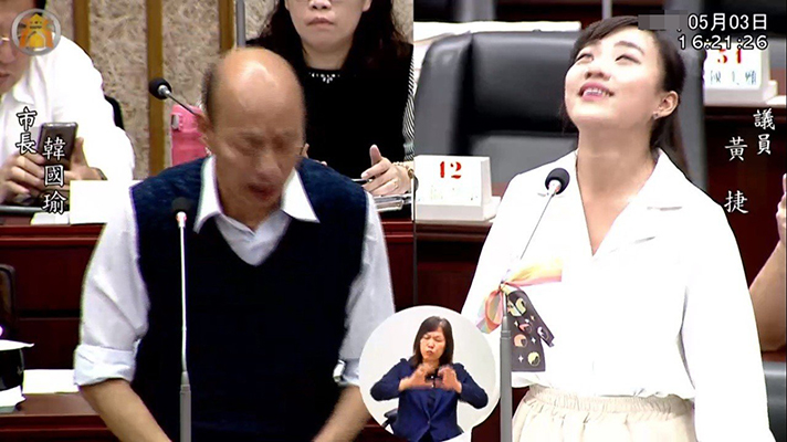 “時代力量”高雄市議員黃捷(右)3日質詢市長韓國瑜有關自由經濟貿易區時,因韓國瑜回答“高雄要發大財”而驚呼仰頭翻白眼。(圖片取自台媒)