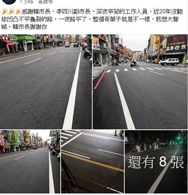 一位網友在“韓國瑜後援會”PO出多張鳳山區五甲道路照片,感謝辛苦的工作人員,讓凹凸不平龜裂的路,一夜路平了。(圖片來自台媒)
