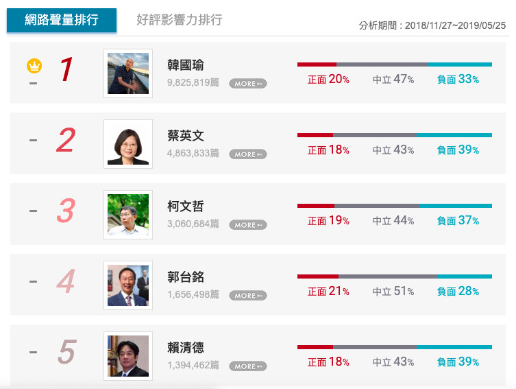韓國瑜至今仍然是政治人物網絡聲量的第1名,雖然縣市長選舉期的高峯已過,但平均每天仍有高達54708筆的網絡聲量。上個月才列入百大政治人物名單的郭台銘,從4月17日宣佈參加國民黨初選後就創造將近17萬的網絡聲量高峯,立刻擠進第19名,之後透過直播、下鄉、幫記者綁鞋帶等持續創造網絡討論量攀升至第4名。