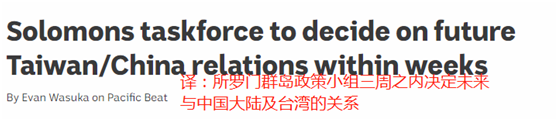 對所羅門羣島政府成立的這個跨黨派小組,日前,新西蘭媒體“新西蘭國家廣播電台”(RNZ)6月17日的報道已提到,該小組將評估所羅門羣島與台灣的關係,並考慮與中國大陸建交的利弊。