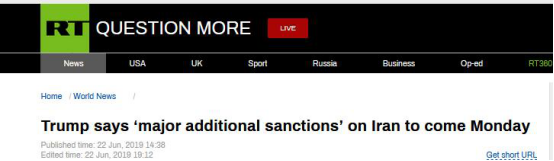 RT提到,22日早些時候,特朗普曾表示,“我們正在(對伊朗)實施更多制裁。”他沒有具體説明新一輪制裁的內容。當天,特朗普曾告訴記者,在這個伊斯蘭共和國“重新開始”很重要。他還將自己的競選口號用在伊朗身上,“讓我們讓伊朗再次偉大。”