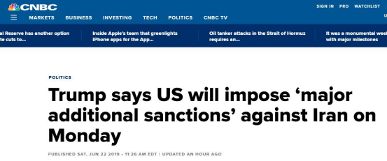 【環球網報道 記者 李東堯】“美國將於週一(24日)對伊朗實施‘重大額外製裁’。”特朗普當地時間22日在推特上宣佈的這一消息,當天引起了多家媒體關注。此前,伊朗擊落一架美軍無人機,特朗普政府差點將美伊緊張推向軍事衝突邊緣。