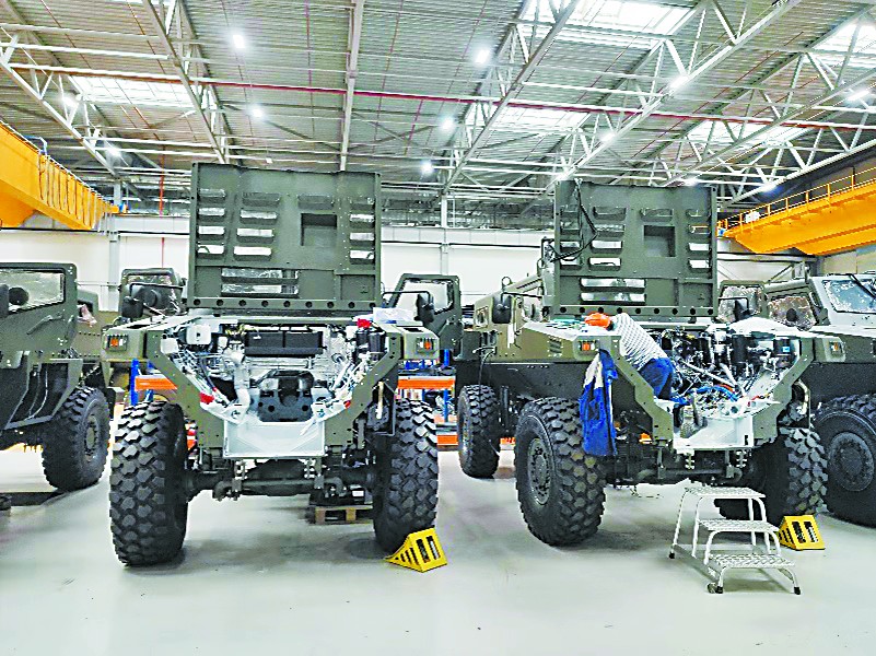 一進入廠房,就看到生產線終端停放數十輛裝甲車,還有工作人員在安裝零件。往裏走則依次是裝甲車製造環節中的零部件焊接、鋼塊切割、組裝、噴漆等各個工序。