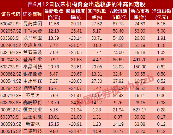 從主力資金方面來看,對於部分衝高回落的股票,機構獲利資金出逃明顯。自6月12日以來,共有16只個股遭機構資金淨賣出超過1000萬元。其中,昆藥集團、中鋼天源期間淨流出最多,均超過5億元;龍馬環衞、眾應互聯、蘭石重裝緊隨其後,期間淨流均超過1億元。