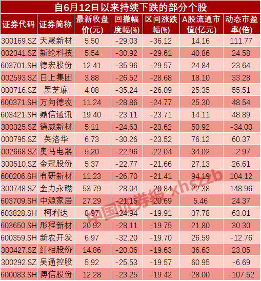 中證網訊 近期A股市場走出一波穩步上升行情,自6月12日以來上證綜指累計上漲2.92%。不過期間不少個股不僅沒有跟漲,反而大幅回撤。據wind數據統計,剔除年內新股及ST股,自6月12日以來,共有123股的最新收盤價較區間最高價的回撤幅度超過了20%。