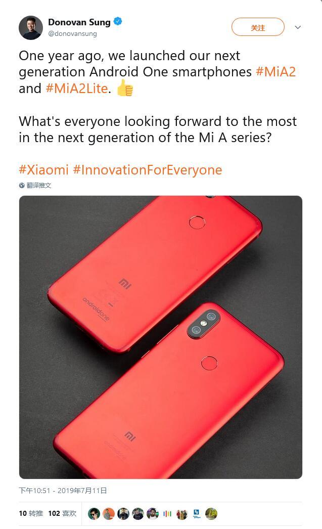 小米全球發言人Donovan Sung在其個人推特上發佈了小米A3的預告:一年前我們發佈了新一代Android One手機小米A2和A2 Lite。你們最希望在下一代小米A系列手機中看到什麼?