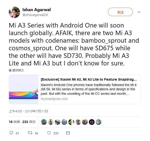 根據爆料人士@IshanAgarwal24透露的信息,即將到來的小米A3內部代號為“bamboo_sprout”(竹筍?),將會裝備高通驍龍730處理器;而小米A3 Lite內部代號為“cosmos_sprout”,將會裝備高通驍龍675處理器。