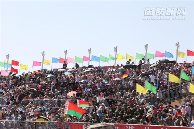 11時30分,當陸軍政治委員劉雷用洪亮的聲音宣佈“國際軍事比賽-2019”正式開幕後,參賽官兵和現場觀眾發出雷鳴般的掌聲,大家揮舞國旗和賽旗,喜悦之情洋溢在戈壁大漠。