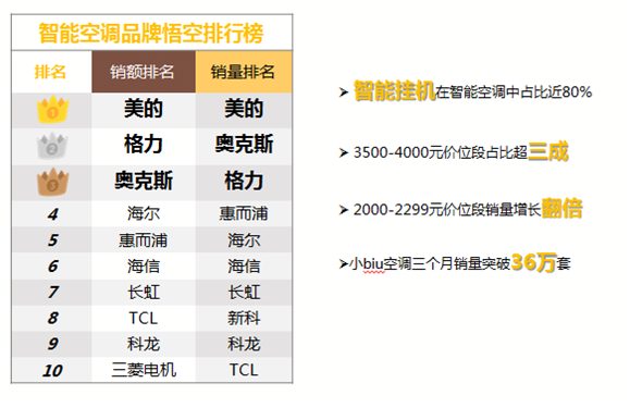 據蘇寧大數據,2019年1—6月,智能電視佔比接近100%,海信、創維、TCL位列銷額前三;智能掛機在智能空調中佔比近80%,美的、格力、奧克斯位居銷額前三。全智能小Biu空調上市以來,3個月銷量突破36萬套,在智能空調品牌中表現突出;智能冰箱產品在蘇寧渠道的銷售佔比超35%;飲水機等水家電智能化率達30%;電蒸箱、淨水器等產品智能化率較高,超過80%。