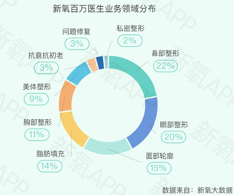 鼻部則是誕生新氧百萬醫生最多的地方,其次是眼部。新氧預測未來眼鼻部仍是誕生「大咖」醫生的主要領域,其它可期增長的領域還有抗衰抗初老、問題修復、私密整形三個領域,這三個領域或因未來需求增長可期,或因技術難度高而被看好。