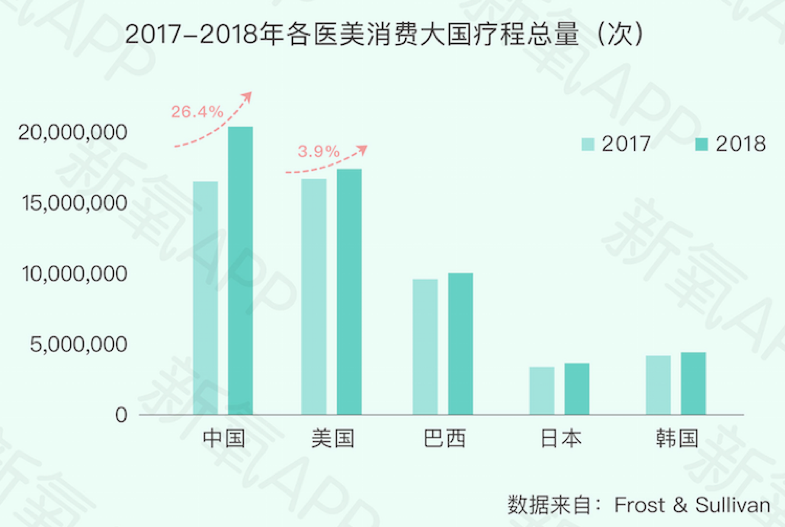 8 月7 日,《新氧 2019 醫美行業白皮書》正式對外發布。根據今年的白皮書顯示,中國醫美市場仍在高速發展。2019 年 4 月,Frost & Sullivan 調查顯示,2017 年中國醫美療程消費類為 1629 萬,僅次於美國的 1634 萬,且中國年增速 26.4%,遠超美國的 3.9%。以此推算,2019 年中國醫美療程消費量將超過美國巴西日本韓國這些醫美消費大國,居全球第一。