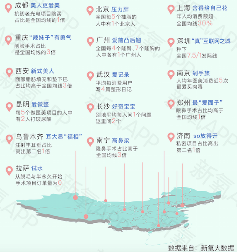 不同城市醫美市場的區別也表現在消費項目的不同。通過《白皮書》裏「中國醫美消費地圖」可以看到,一線城市的醫美更多處理的是壓力帶來的影響,比如發胖、脱髮、初老。而新一線和二線城市更多圍繞變美和「性」福感在發力,比如南京最多剁手族,濟南私密項目消費佔比高出第二名 1 倍。