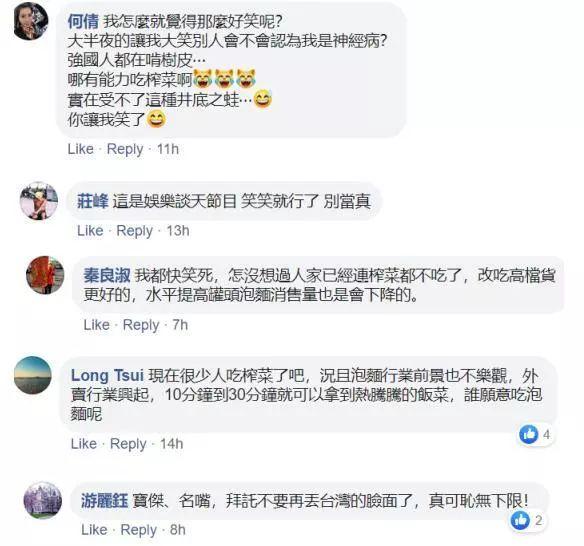 而此時此刻在台灣,也有不少網民覺得這檔宣稱“大陸人吃不起榨菜“的節目以及拋出這一白痴説法的”名嘴“很丟人,甚至有台灣網民表示,這些人拉低了台灣的智商,搞得台灣風評被害……