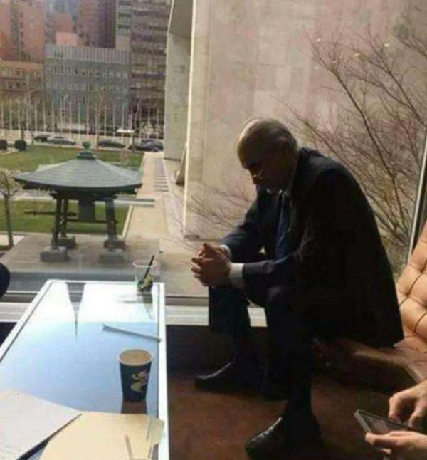 美英法三國對敍利亞發動軍事打擊後,敍利亞駐聯合國代表賈法裏悵然獨坐,顯得無奈又無助。