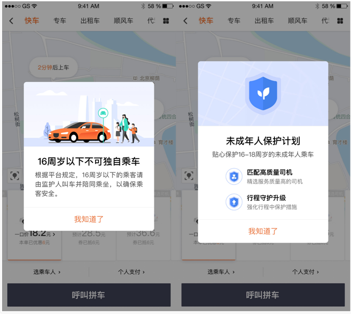 其中“未成年人保護計劃”是指,對於在平台上留有實名信息的用户,只要年齡超過16歲未滿18歲,乘客必須設置緊急聯繫人後才能獨自乘車,以便乘車人的親友與平台一起關注出行狀況,隨時給予必要的幫助。此外,平台還會給乘客匹配服務評價更高的司機,增強對乘客的安全提醒和引導,同時加強對行程中車輛異常停留、路線偏移等情況的監控和干預。
