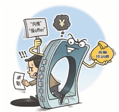 如今網絡上常見的求職平台主要有兩種:一種是單純分享招聘信息的,另一種是通過吸引求職者交費購買課程或內推資格來賺錢。在網絡時代,線上求職中介利用其信息豐富、傳播效率高、成本低等優勢成為連接企業與求職者的重要載體。然而,平台提供的信息魚龍混雜,剛踏入社會的大學生往往防範意識較為薄弱,又迫切地尋求理想職業,讓一些不法分子有機可乘。