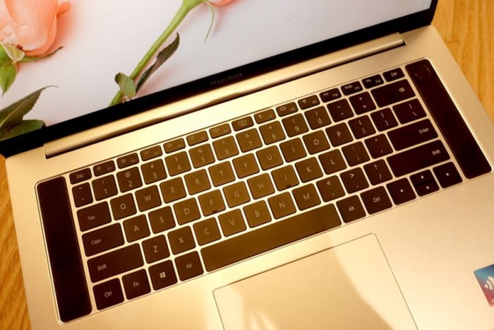 MagicBook Pro的C面設計上看較為中規中矩,鍵盤兩側是音響,MagicBook Pro特有的“電源指紋二合一”按鈕巧妙的隱藏在了鍵盤右側的音響中。最值得一提的莫過於MagicBook Pro此次將攝像頭隱藏在了鍵盤裏面,在F6和F7按鍵中間有一個攝像頭按鍵,只需輕輕按下,隱藏的攝像頭便會彈起來,再次輕按即可隱藏。這樣的設計使得B面屏幕不必在為攝像頭留出多餘位置,可以將屏幕鋪滿、邊框做的更窄,這樣就提高了屏佔比。