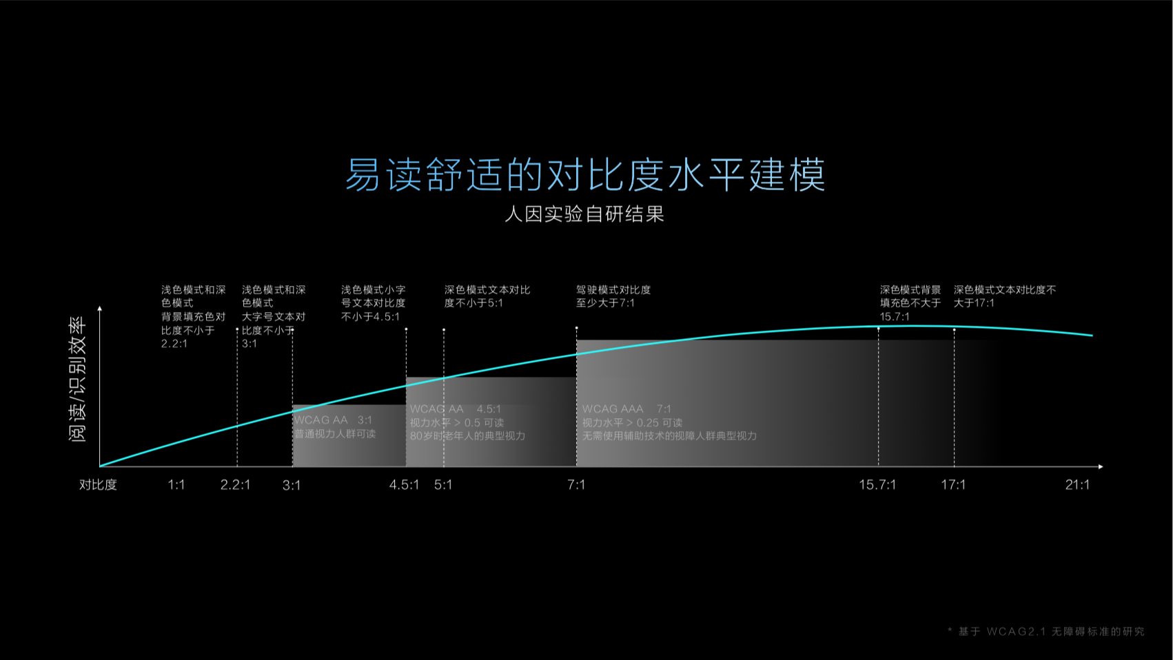 為適配出最佳的對比度解決方案,華為人因研究團隊採用主觀評價、心理物理法、操作績效評估、眼動研究等方法,經過大量的實驗與用户調研,終於得到手機界面上的易讀的對比度下最佳解決方案。