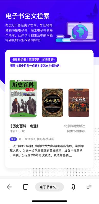 習需求。尤其是專業知識搜索,搜索結果的專業權威性最為關鍵。為此,夸克與百餘家版權商達成合作,推出了電子書全文檢索功能,成為業內首家支持出版物全文檢索的中文搜索引擎。為對歷史、文學、健康等領域感興趣的學生帶來新福利,搜索“商鞅變法”等歷史事件,夸克會直接給出《歷史百科一點通》、《歷史的魔咒》等電子書籍,點擊即可翻閲書籍相關部分的介紹。