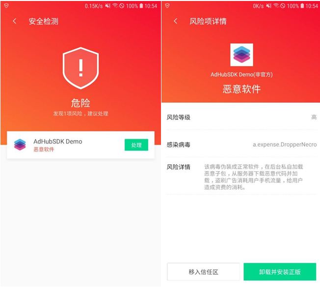 近日,騰訊安全發現一款名為“DropperNecro”的惡意病毒,隱藏在AdHub SDKDemo軟件中,對用户手機實施多類型病毒攻擊。對此,騰訊手機管家依託騰訊自研AI反病毒引擎TRP-AI和自研殺毒引擎TAV,已對AdHub SDK Demo病毒軟件進行精準查殺,保護用户信息財產安全。