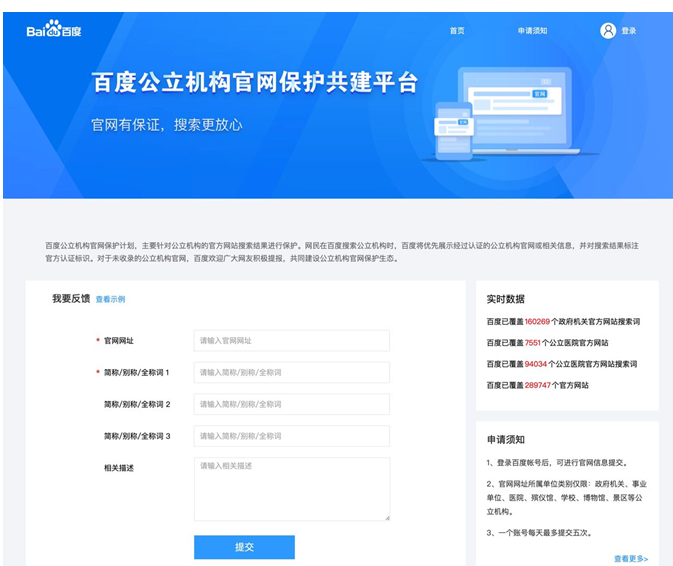 據悉,一個百度賬號每天最多提交五次。官網網址所屬單位類別僅限:政府機關、事業單位、醫院、殯儀館、學校、博物館、景區等公立機構。但需提交的網站在國家工信部備案的主體類型為:事業單位,政府機關,軍隊,國防機構,基金會。